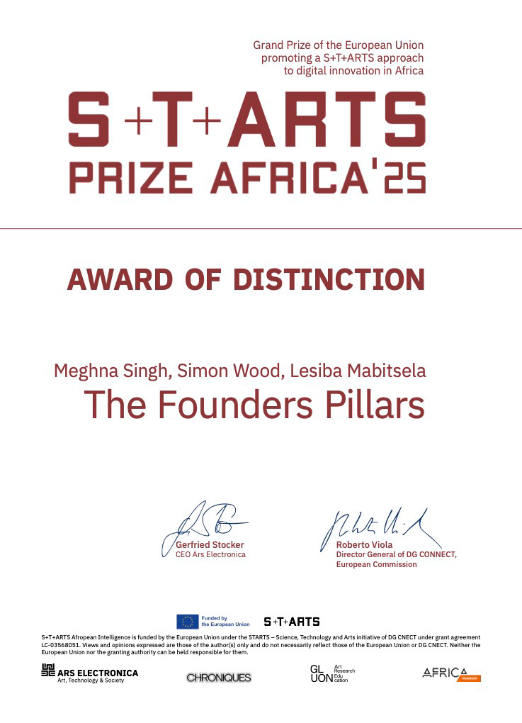 Developed through the MIT Open Documentary Lab, The Founders Pillars draws from six regions of the African continent, each represented by a distinct textile, an associated myth or story, bought to life by AI generated films and AR. As a travelling memorial, the project uses sound, animation, and smart textile visualisation to embed ancestral memory and cosmology into digital cloth, activating public space. The experience not only reveals suppressed histories but celebrates African interconnectedness. As a communal audio-visual technological experience, it transforms pillars of colonial power into spaces of de colonial expression.
